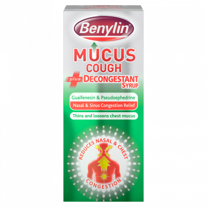 Benylin Mucus Cough With Decongestant Syrup contains the active ingredients guaifenesin and pseudoephedrine.