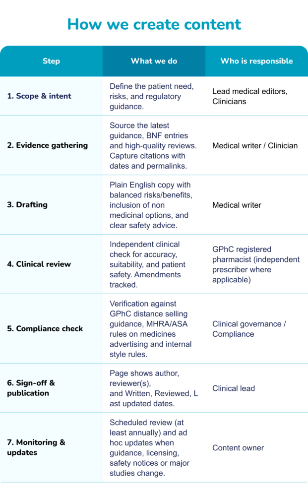 Our patients always come first, which is why our content follows strict guidelines. These guidelines ensure we provide safe, credible, and authentic information that supports the health and well-being of everyone who visits our website. They also ensure our content is in line with regulatory standards and adheres to all guidelines for the safe prescribing of medication in the United Kingdom.