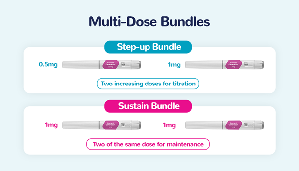 - Step-up bundles – 2 pens that follow your titration schedule, including your current pen and the next strength up.