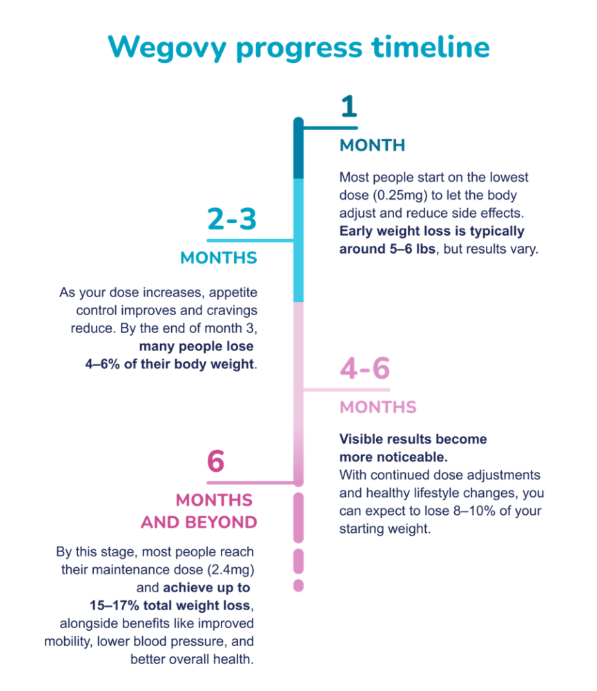 6 months and beyond: By this stage, most people reach their maintenance dose (2.4mg) and achieve up to17% total weight loss, alongside benefits like improved mobility, lower blood pressure, and better overall health.